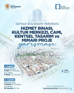 Samsun Büyükşehir Belediyesi öncülüğünde ve TMMOB Mimarlar Odası Samsun Şubesi paydaşlığında ulusal ölçekte düzenlenen “Samsun Büyükşehir Belediyesi Hizmet Binası, Kültür Merkezi, Cami, Kentsel Tasarım ve Mimari Proje Yarışması” 9 Mart 2026 tarihinde ilan edilmiştir.